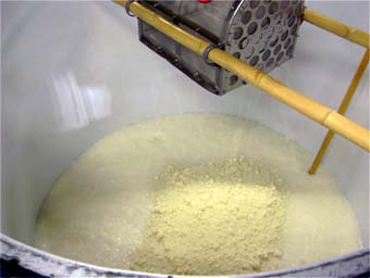 | 7 上槽 | できたお酒を搾ります。 搾り方によって、「にごり酒」(粗い布でこしたもの)、「あらばしり」(圧搾する前に流れ出てくる最初の液体)、「雫酒」(酒袋に入れて吊るし、自然に流れ落ちる液体をとったもの)などの呼び名がありますが、厳密な決まりはないそうです。 お酒を搾ったあとの残りが、酒粕です。 | ||||||